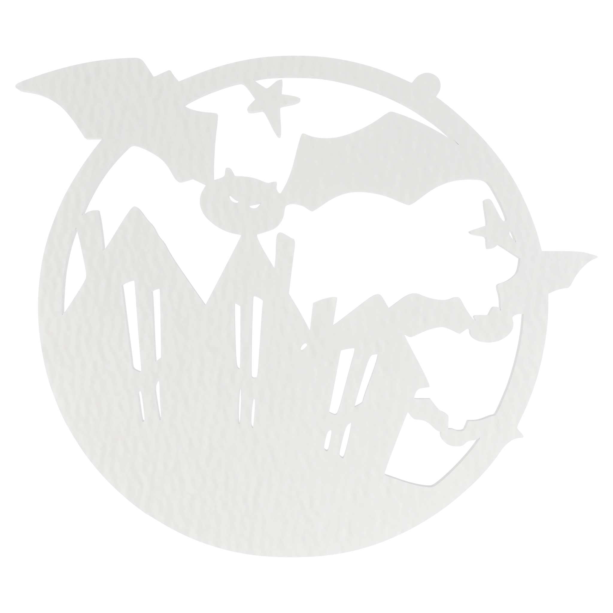 Ozdoba Halloween w formie obręczy z miastem i nietoperzami to elegancki, a zarazem mroczny akcent dekoracyjny. Wewnątrz obręczy widoczny jest zarys miasta, z gotyckimi budowlami i wysokimi wieżami, co nadaje scenerii tajemniczości. Nad miastem krążą nietoperze, które dodają ruchu i dynamiki całej kompozycji. Tego typu dekoracja doskonale sprawdzi się jako ozdoba na drzwiach lub ścianie, tworząc wyjątkowy klimat pełen tajemnicy i grozy.