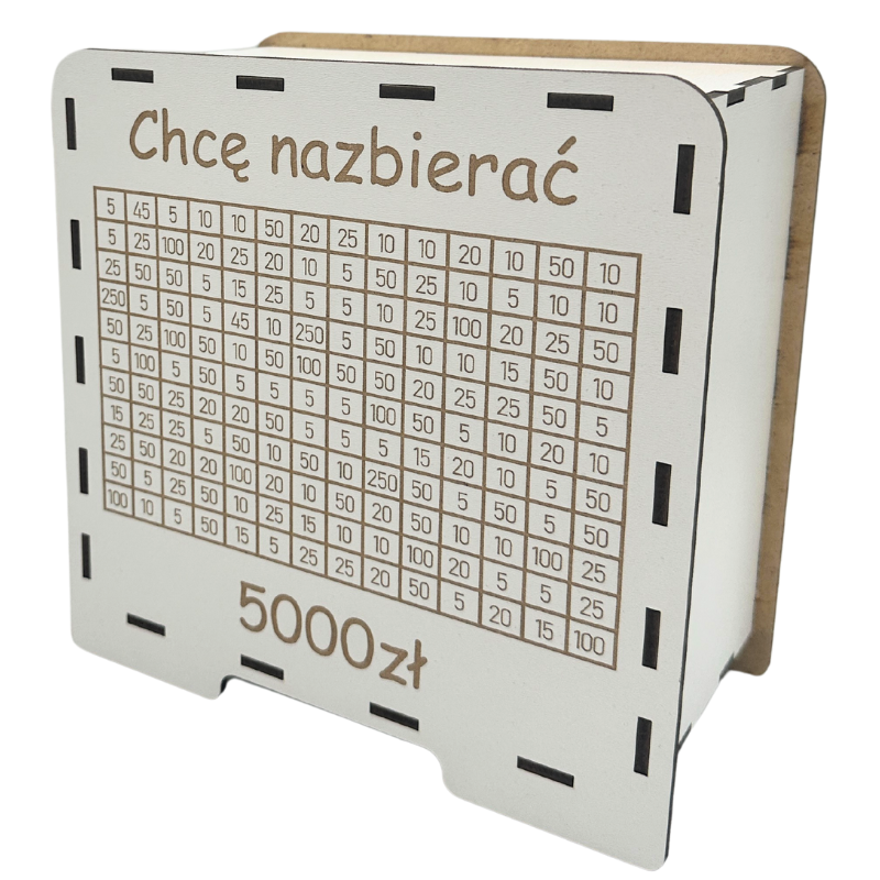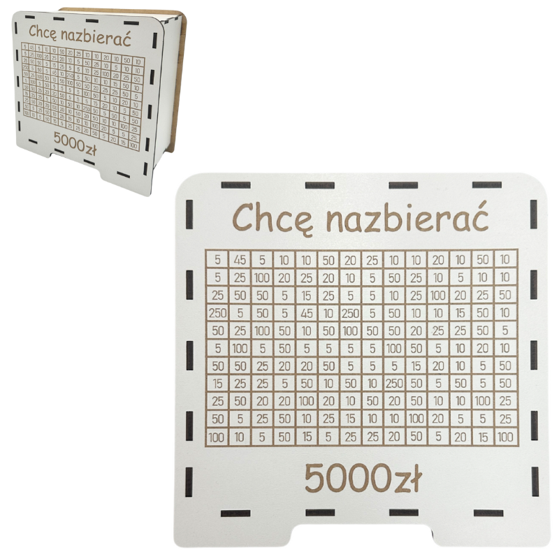 • Wygrawerowana tabelka: Na powierzchni skarbonki znajduje się tabelka, w której można wykreślać kolejne kwoty w miarę dodawania gotówki.