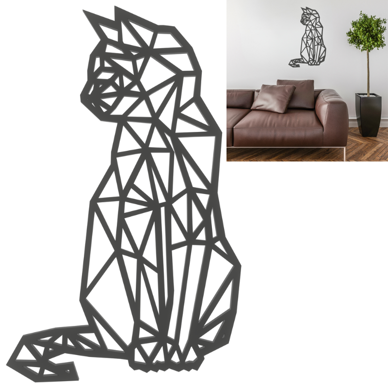Kot geometryczny z drewna sklejki. Jego sylwetka jest elegancka i smukła, z delikatnie zaznaczonymi uszami, łapami i ogonem. Sklejka, z której wykonano kota, ma naturalną fakturę drewna, co nadaje całej kompozycji rustykalny i przytulny charakter. Kot ma minimalistyczny, ale wyrazisty kształt, który sprawia, że jest on idealnym dekoracyjnym akcentem na ścianę, wpasowującym się zarówno w nowoczesne, jak i klasyczne wnętrza.