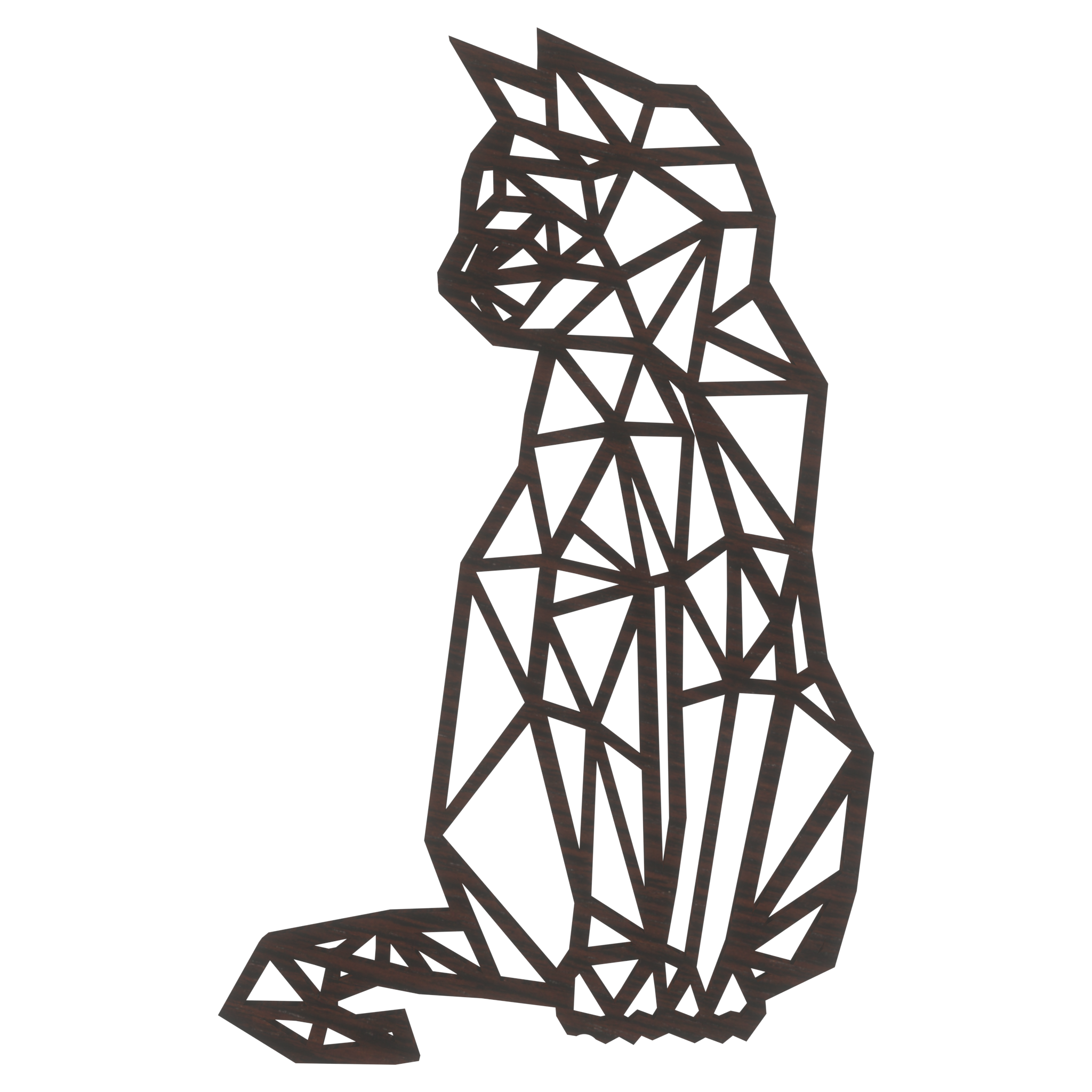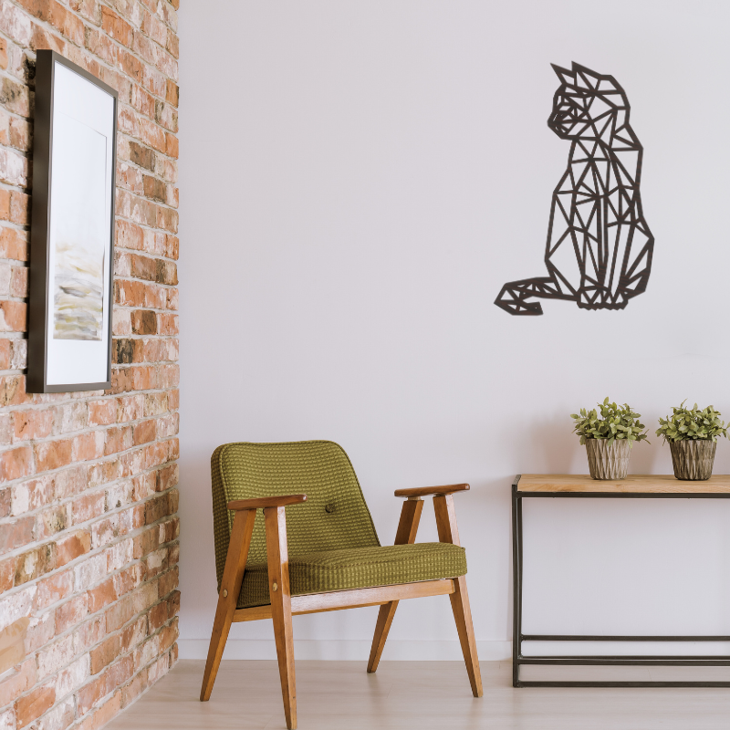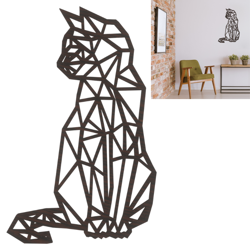 Kot geometryczny na ścianę, jego sylwetka jest elegancka i smukła, z delikatnie zaznaczonymi uszami, łapami i ogonem. Kot ma minimalistyczny, ale wyrazisty kształt, który sprawia, że jest on idealnym dekoracyjnym akcentem na ścianę, wpasowującym się zarówno w nowoczesne, jak i klasyczne wnętrza.