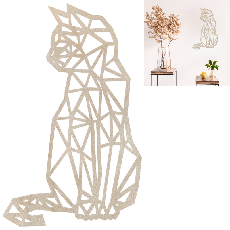 Kot geometryczny na ścianę z drewna sklejki. Jego sylwetka jest elegancka i smukła, z delikatnie zaznaczonymi uszami, łapami i ogonem. Sklejka, z której wykonano kota, ma naturalną fakturę drewna, co nadaje całej kompozycji rustykalny i przytulny charakter. Kot ma minimalistyczny, ale wyrazisty kształt, który sprawia, że jest on idealnym dekoracyjnym akcentem na ścianę, wpasowującym się zarówno w nowoczesne, jak i klasyczne wnętrza.