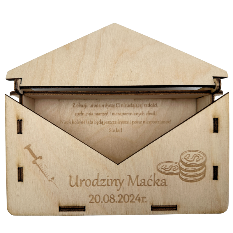 DREWNIANA KOPERTA ZASTRZYK GOTÓWKI NA PIENIĄDZE PREZENT PERSONALIZOWANA