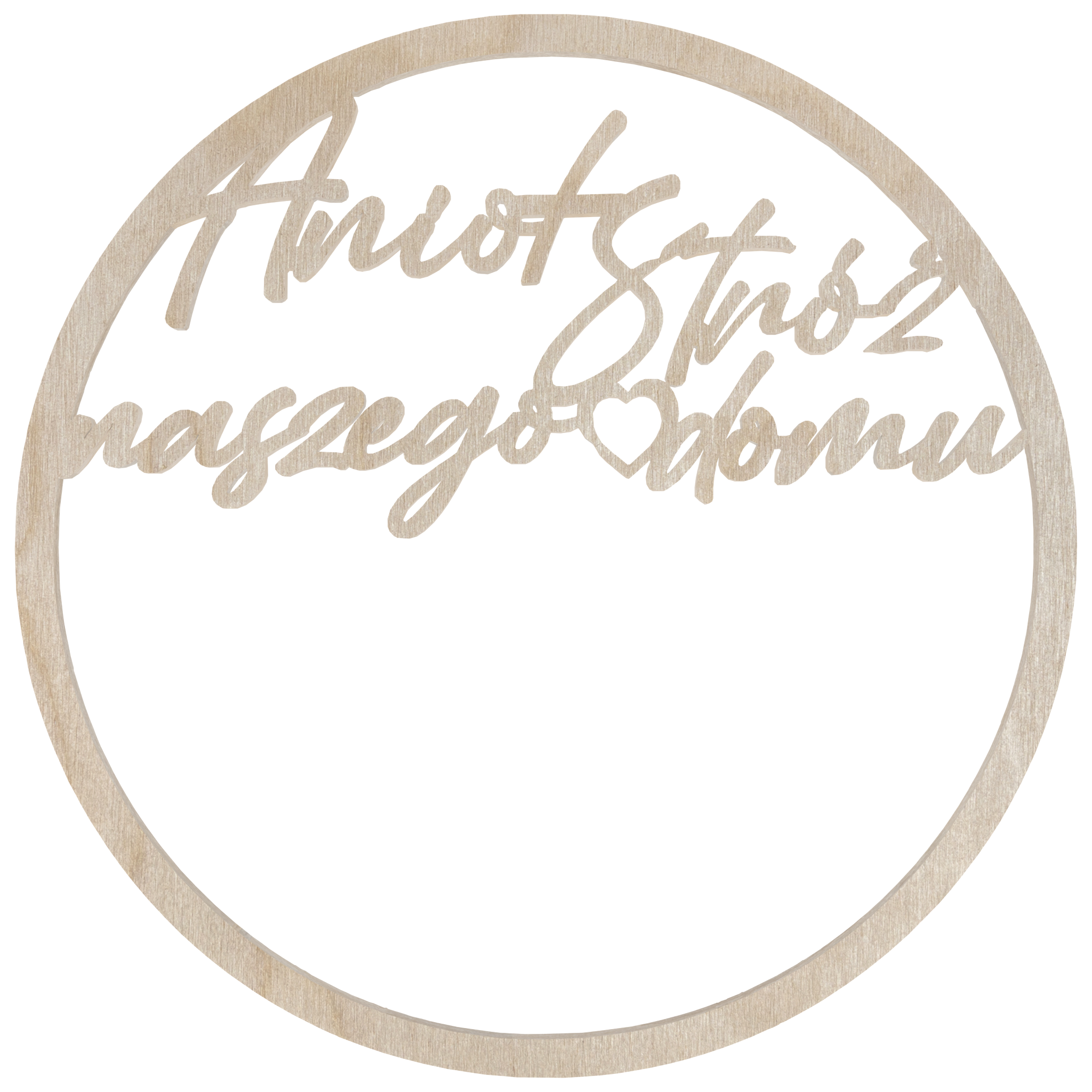 Drewniana obręcz z napisem „Anioł Stróż naszego domu”. Doskonała do tworzenia unikalnych, ręcznie robionych dekoracji.