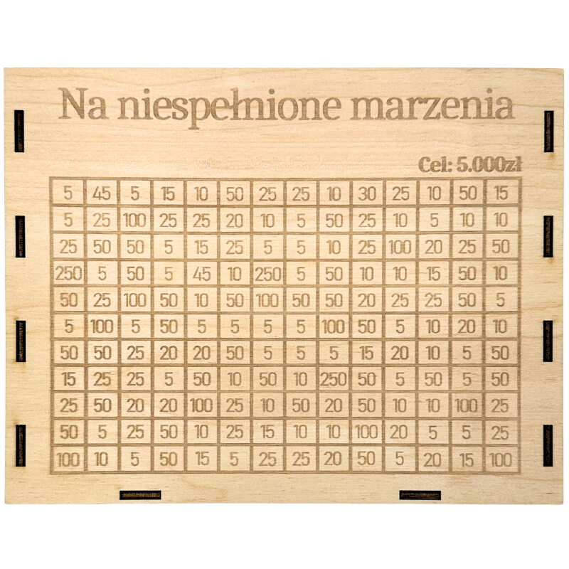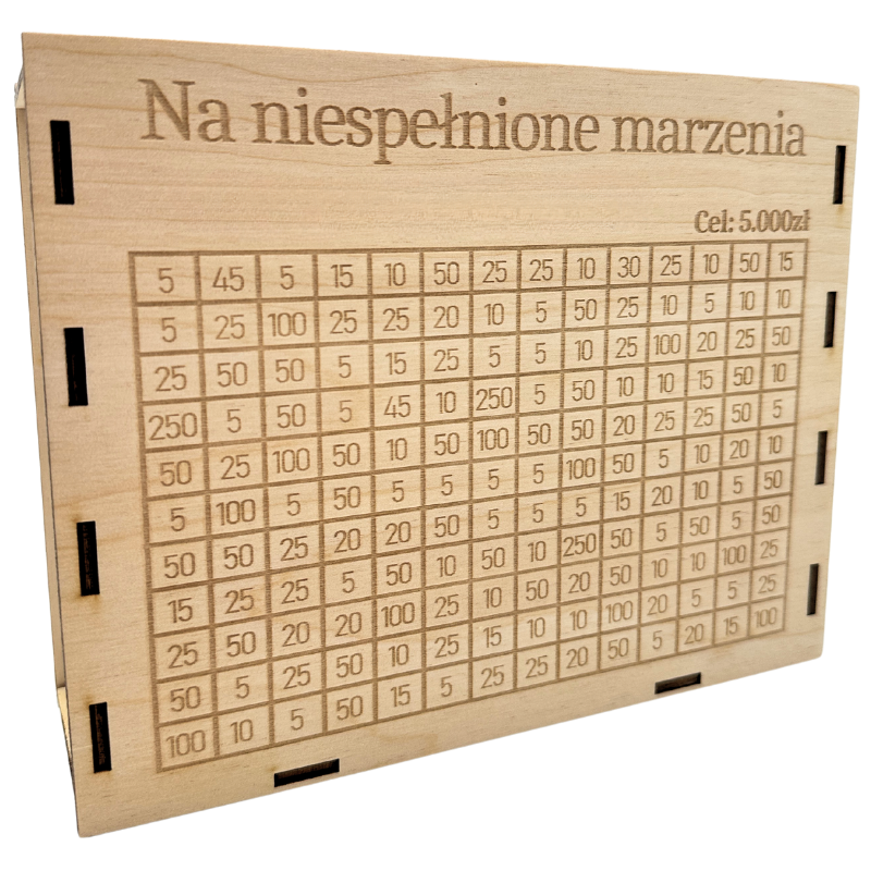 - Wygrawerowana tabelka: Na powierzchni skarbonki znajduje się tabelka, w której można wykreślać kolejne kwoty w miarę dodawania gotówki.