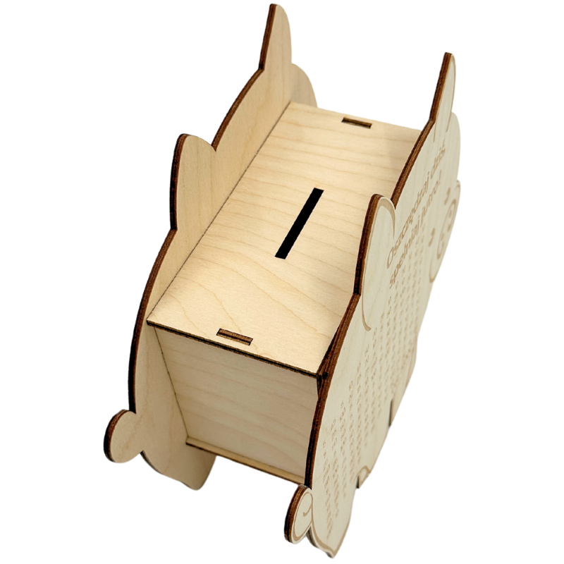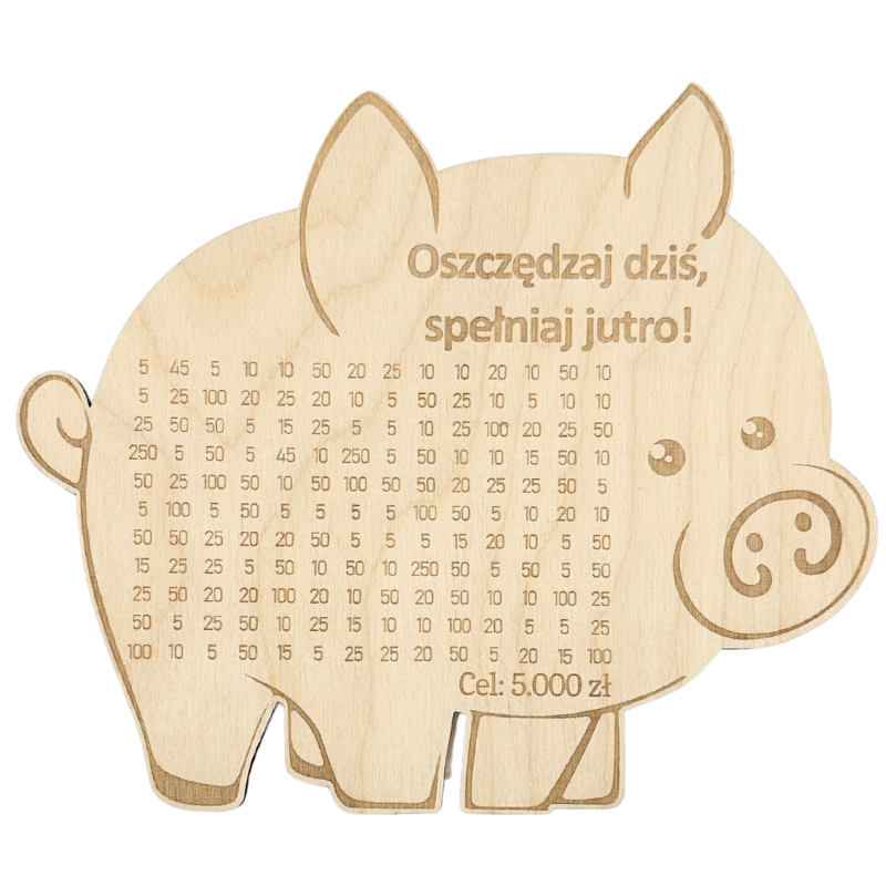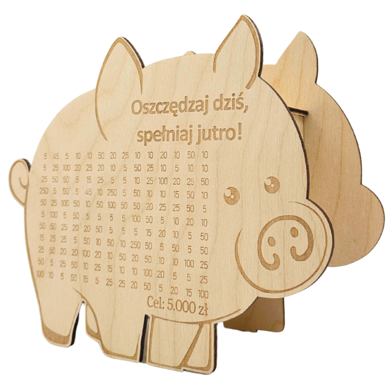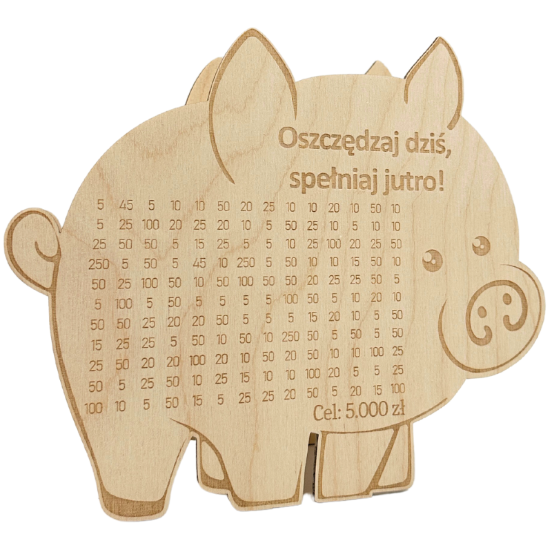 - Wygrawerowana tabelka: Na powierzchni skarbonki znajduje się tabelka, w której można wykreślać kolejne kwoty w miarę dodawania gotówki.