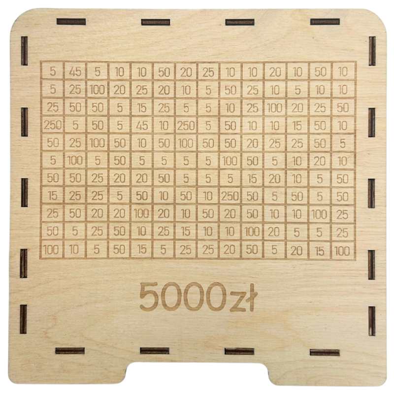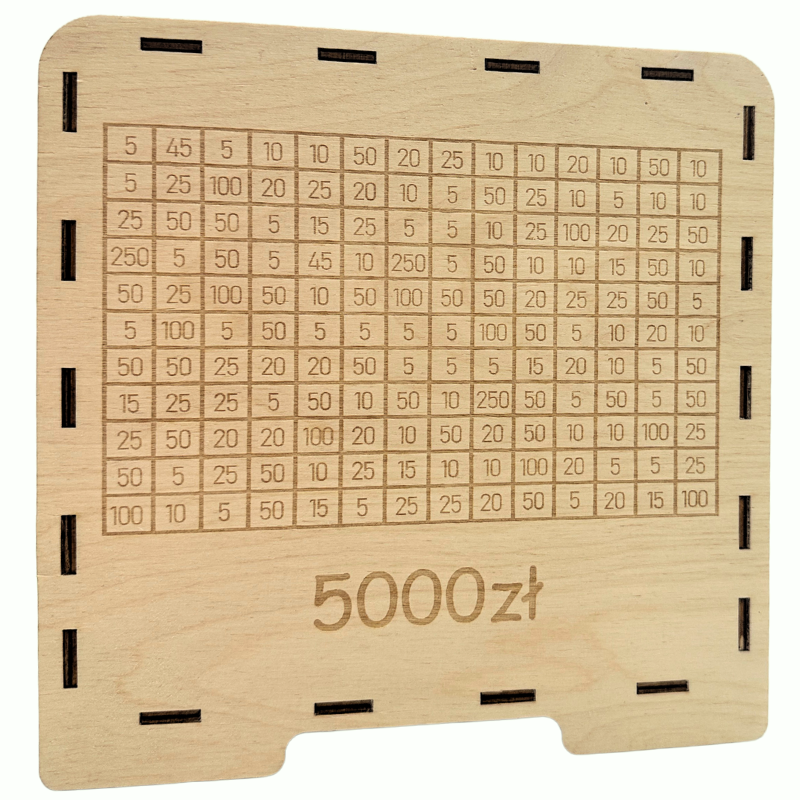 - Wygrawerowana tabelka: Na powierzchni skarbonki znajduje się tabelka, w której można wykreślać kolejne kwoty w miarę dodawania gotówki.