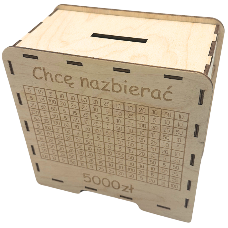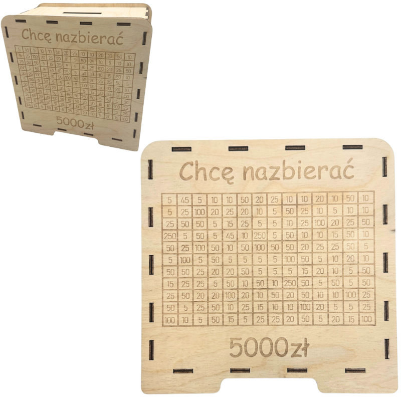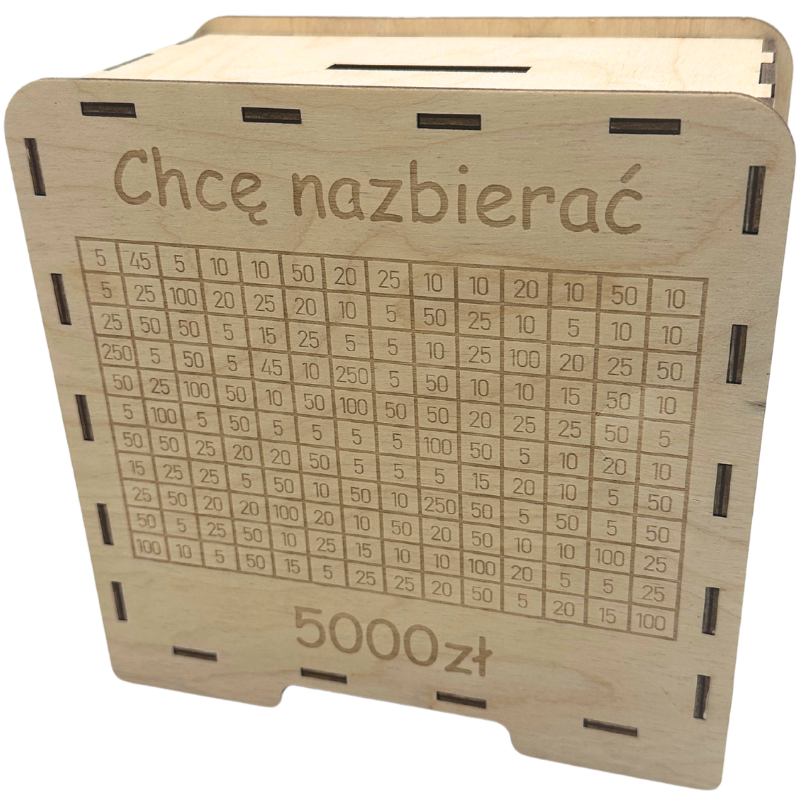 - Wygrawerowana tabelka: Na powierzchni skarbonki znajduje się tabelka, w której można wykreślać kolejne kwoty w miarę dodawania gotówki.