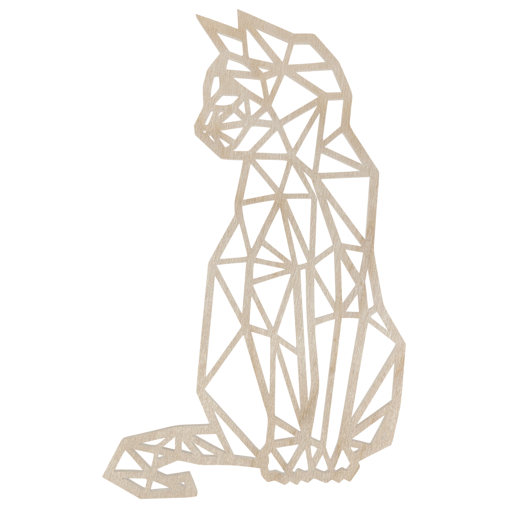 Kot geometryczny z drewna sklejki. Jego sylwetka jest elegancka i smukła, z delikatnie zaznaczonymi uszami, łapami i ogonem. Sklejka, z której wykonano kota, ma naturalną fakturę drewna, co nadaje całej kompozycji rustykalny i przytulny charakter. Kot ma minimalistyczny, ale wyrazisty kształt, który sprawia, że jest on idealnym dekoracyjnym akcentem na ścianę, wpasowującym się zarówno w nowoczesne, jak i klasyczne wnętrza.