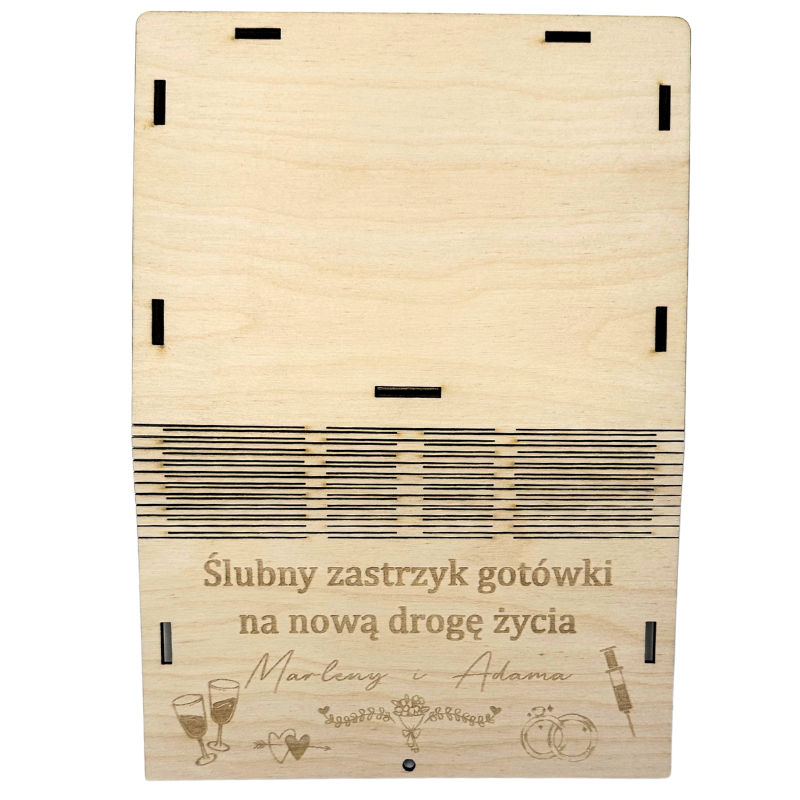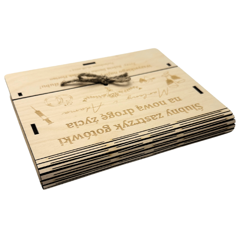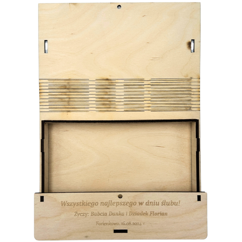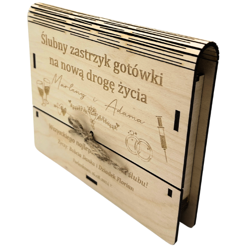 Koperta-pudełko z drewna sklejki na ślub to wyjątkowy sposób na wręczenie pieniędzy młodej parze. Pudełko wyróżnia się eleganckim i naturalnym wyglądem. Jego powierzchnia jest ozdobiona grawerowanymi wzorami, imionami młodej pary,krótkimi życzeniami oraz datą ślubu. Wewnątrz znajduje się miejsce na umieszczenie banknotów, małego upominku lub kartki z życzeniami. Ten stylowy i oryginalny upominek nie tylko praktycznie przechowa podarowaną gotówkę, ale także stanie się piękną pamiątką na lata.