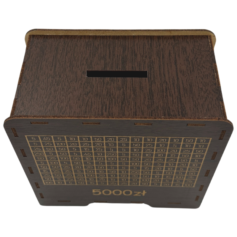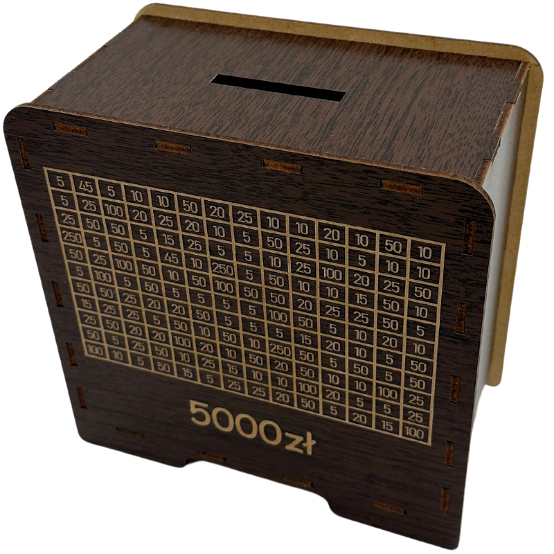 - Wygrawerowana tabelka: Na powierzchni skarbonki znajduje się tabelka, w której można wykreślać kolejne kwoty w miarę dodawania gotówki.