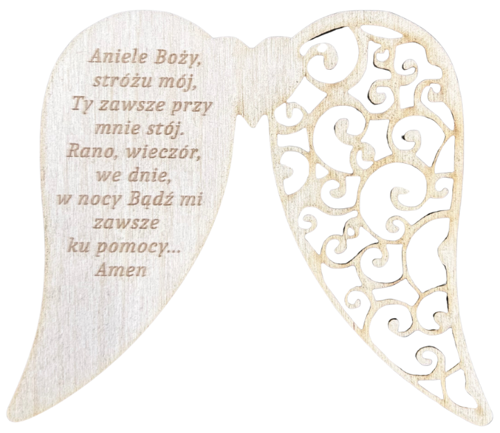 Modlitwa „Aniele Boży” wkomponowana w design skrzydełka dodaje mu dodatkowego znaczenia, sprawiając, że staje się inspirującym elementem dekoracyjnym i źródłem duchowej siły dla wszystkich, którzy sięgają po nie w chwilach refleksji i modlitwy. Skrzydełka wykonane z naturalnej sklejki drewnianej to idealny materiał do tworzenia uroczych aniołków oraz innych dekoracji związanych z makramą. Ich lekka konstrukcja i gładka powierzchnia pozwalają na łatwe malowanie, zdobienie, czy też przyklejanie dodatkowych elementów. Dzięki swojej naturalnej estetyce nadają wyjątkowy urok każdemu projektowi. Niezależnie od tego, czy tworzymy ozdobę na dekorację ściany czy element stołu, skrzydełka z drewna sklejki są wszechstronnym i kreatywnym materiałem, który pozwala na realizację różnorodnych pomysłów artystycznych.