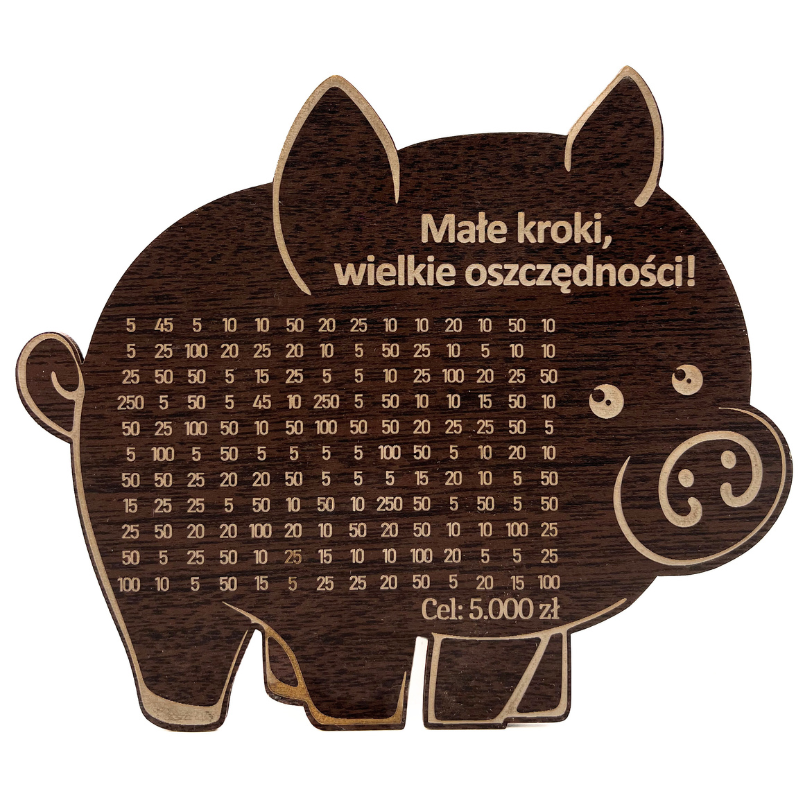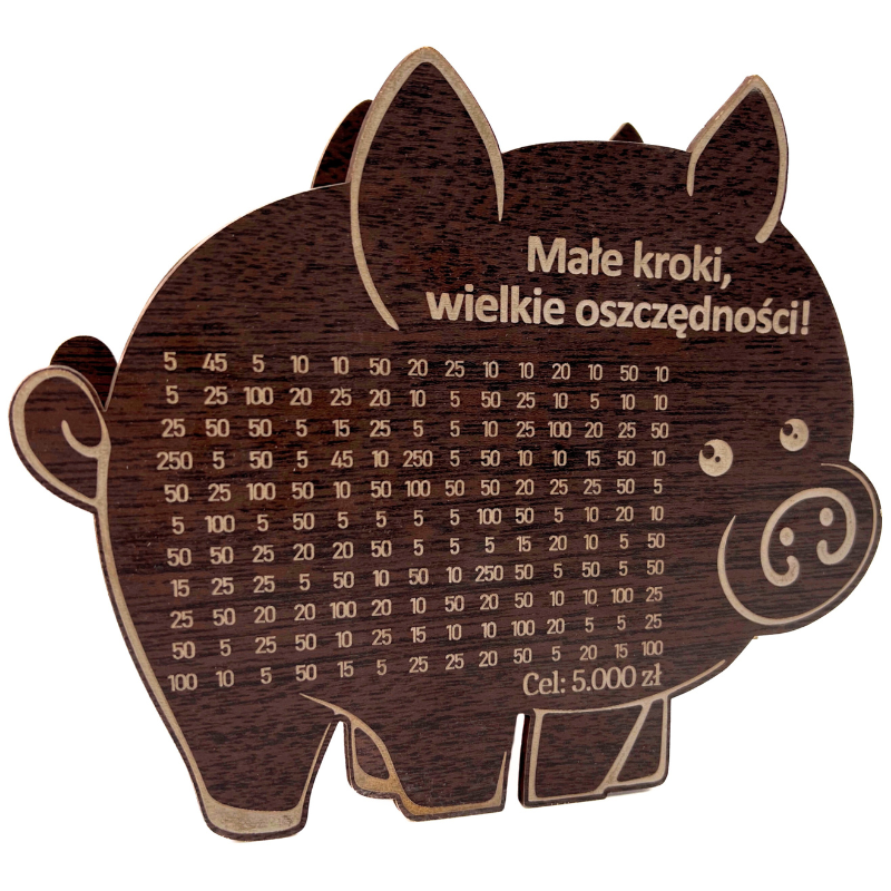 ŚWINKA SKARBONKA MAŁE KROKI WIELKIE OSZCZĘDNOŚCI WYKREŚLANKA DĄB WENGE