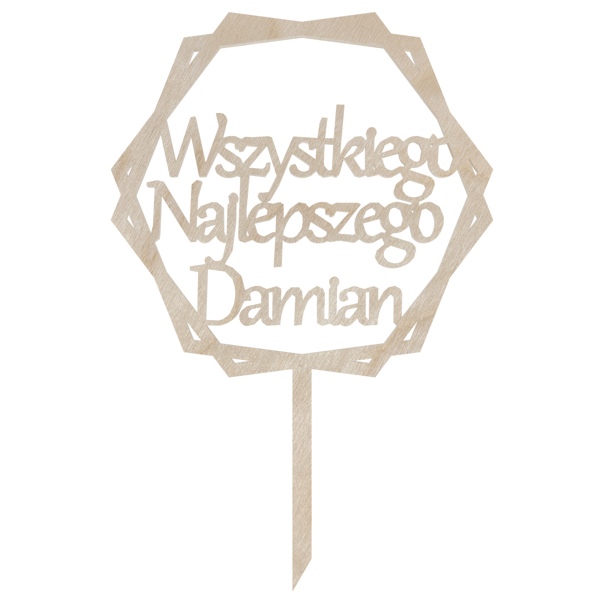 Topper z drewna sklejki z napisem „Wszystkiego najlepszego” w ozdobnym sześcianie i imieniem to elegancki i unikalny dodatek do tortu urodzinowego. Ozdobny sześcian dodaje mu nowoczesnego charakteru. Naturalna faktura drewna nadaje mu rustykalny urok, idealnie komponujący się z różnymi stylami dekoracyjnymi. Personalizacja z imieniem sprawia, że topper staje się wyjątkowy i niepowtarzalny. Można go pozostawić w surowym stanie lub pomalować, aby dopasować do kolorystyki przyjęcia. To piękny sposób na uczczenie urodzin i dodanie osobistego akcentu do tortu.